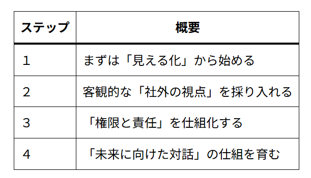 具体的に考えてみましょう。ここでは4つのステップに分けてみます(図表参照)。まずはステップ1です。経営者が「良い会社」を創ろうと努めても、それがその他の利害関係者に理解されなくては困ります。「すべては社長の頭の中」にしかない、という状態を一刻も早く脱却することです。「墓場まで持っていく」と決めた秘密を暴露する必要はありませんが、利害関係者がその企業の存在意義を理解できる「骨組」はぜひ見えるようにしておきたいものです。最も大事な「見える化」は、経営理念などの企業の究極的な将来像や目的、社会的な存在意義を言語化して全社員で共有することでしょう。非上場企業にとってひときわ大事になるステークホルダーとしての従業員が、会社の理念や目標を理解・共感し、主体的に貢献したいと思ってくれることは非常に大事です。また、こうした内容が可視化されることで、経営者は仕事が「楽」になります。何か起こるたびに右往左往しなくても、会社における「憲法」が定まり、全員で共有できれば、そこに判断基準を置けば良いからです。判断基準が確立した企業は、取引先や債権者の信頼も獲得することができるでしょう。実際、我が国のいわゆるご長寿企業の実に7割以上が確固たる企業理念を掲げ、利害関係者と共有し、その遵守と絶え間ない啓蒙活動を続けています。