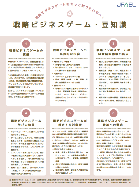 本体験会では、人材育成・研修企画に携わられている皆さまに、実際に戦略ビジネスゲームの実体験を通じて、人材育成コンテンツとしての有用性を体感していただくことを目的としております。