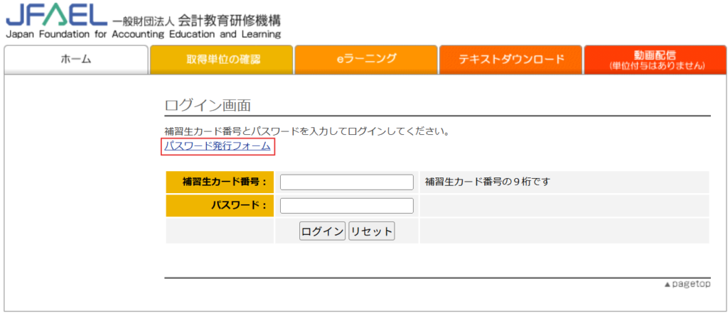 ②ログイン画面の「パスワード発行フォーム」をクリック
