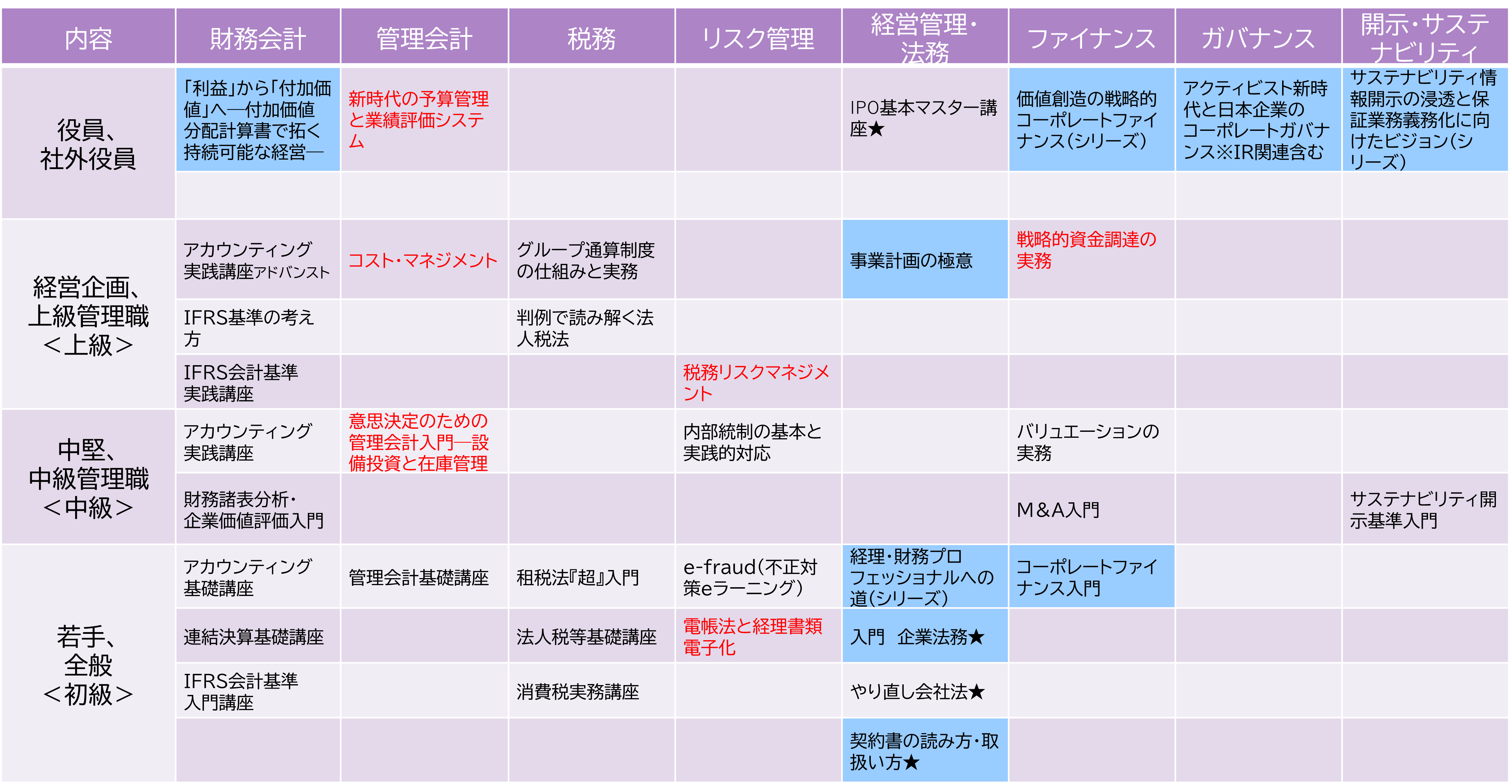 | 中堅、中級管理職 <中級> | アカウンティング実践講座(全10回) | ライブ配信:2025年6月 アーカイブ配信:2025年7月1日以降順次開始~2026年4月30日 | EY新日本有限責任監査法人 |